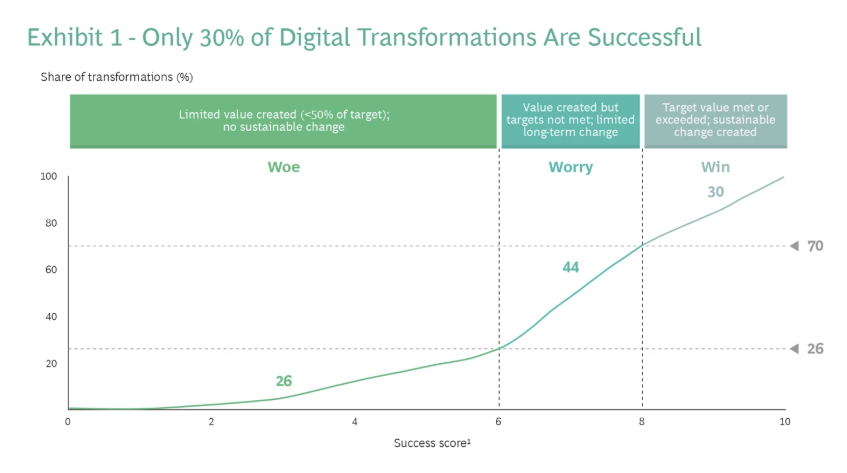Research by BCG shows that 70% of digital transformations by different businesses often fall short of their objectives. Furthermore, according to McKinsey, 17 per cent of IT projects go so bad that they can jeopardise the very existence of the company.
